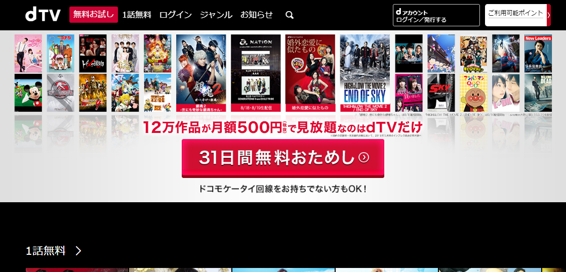 dTVはNTTドコモが提供している動画配信サービスです。NTTドコモのサービスですがドコモユーザー以外でも利用可能で、スマホやタブレットからはもちろん、パソコン、テレビなどで、映画やドラマ、アニメ、バラエティなどの作品を見ることができる。